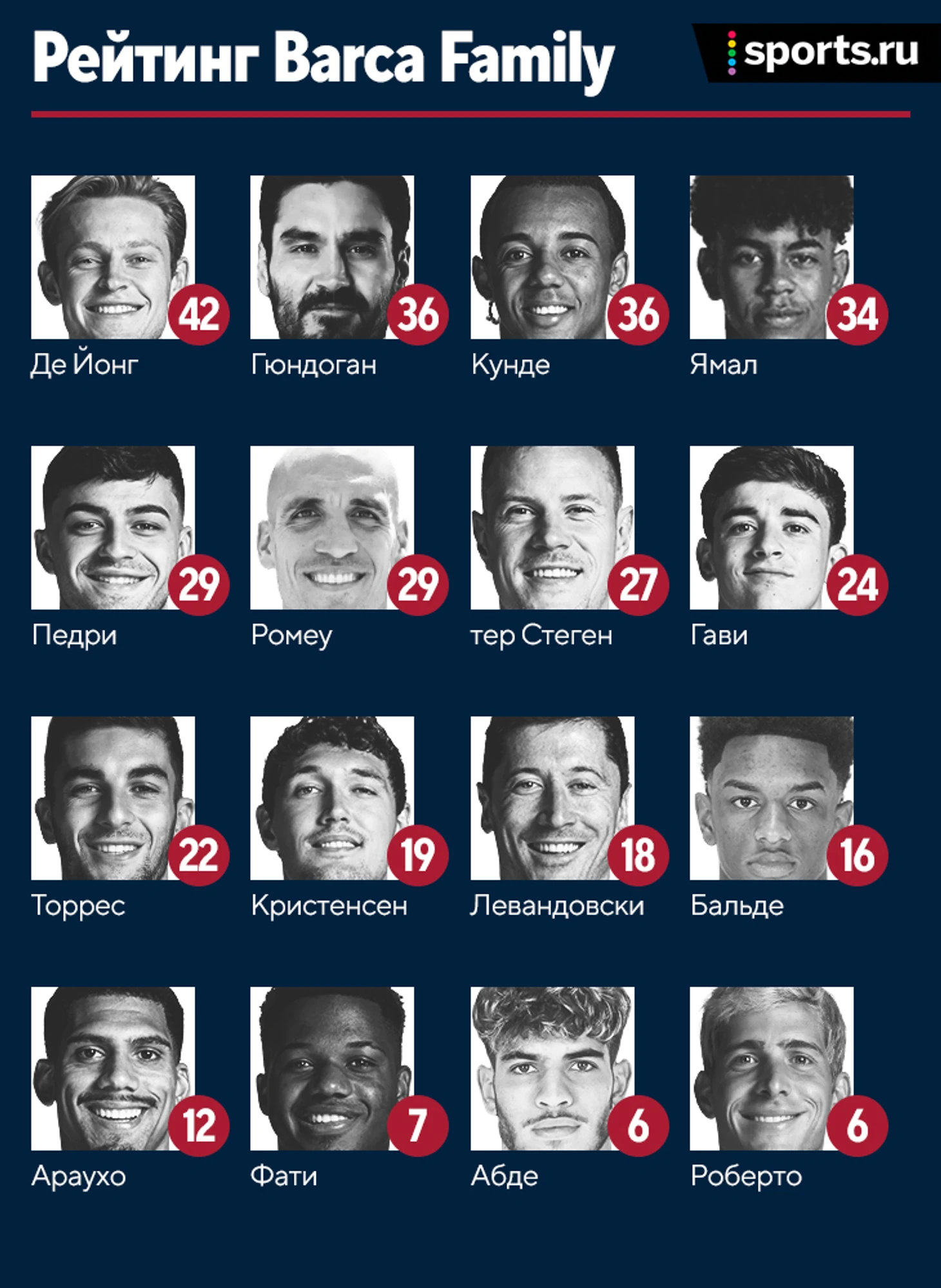 Френки Де Йонг стал безоговорочным лидером «Барселоны» в августе набрав 42 балл. Он играл в опорной зоне, он играл в обороне и даже забил один гол. Пока Френки выглядит самым стабильным футболистом в команде и раз за разом помогает ей добиваться необходимого результата. Удивили Кунде и Гюндоган. Кунде наконец-то отвоевал себе позицию в центре обороны и теперь сражается за нее изо всех сил, что положительно отражается и на его игре. Гюндоган пока только вливается в команду, но за счет своего высочайшего мастерства не теряется на поле и регулярно помогает команде создавать моменты у ворот соперника. Ламин Ямал начал сезон со скамейки, а в затем провел целых два матча в старте, отдал ассист и влюбил в себя каждого поклонника «Барселоны». Теперь он основной конкурент Рафиньи за позицию в составе. Игроки будут чередовать выходы в старте, а конкуренция очень позитивно повлияет на команду и ее результаты.