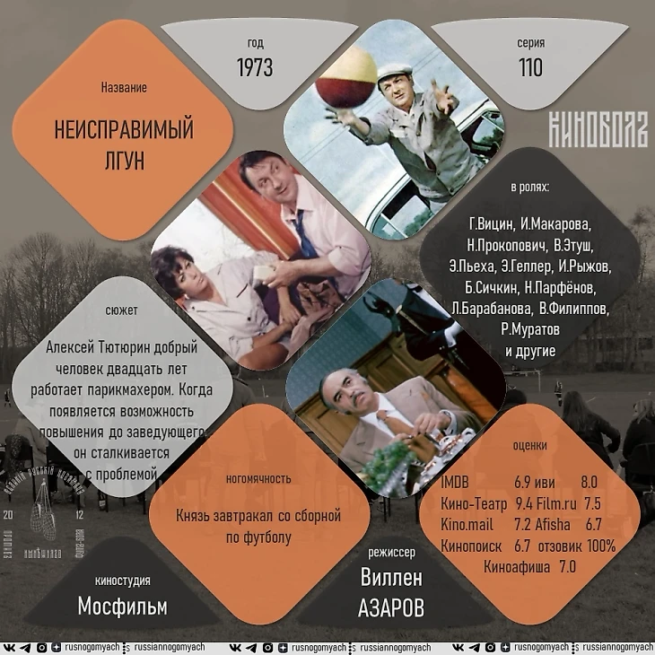 Кино как отражение эпохи. Есть большое количество фильмов эпохи начала застоя, которые очень похожи по стилистике, как и этот. Смотреть его сейчас можно только с большим допущением, что возможно такая жизнь и была. Но нет. А по футболу там тоже есть чуть-чуть упоминание.