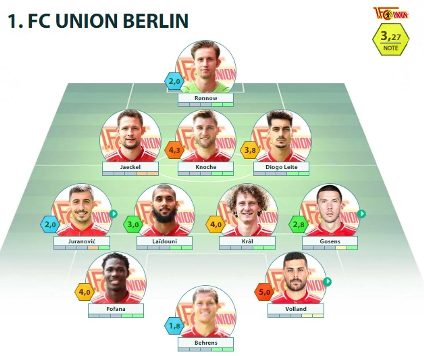 «Унион»: Ronnow - Jaeckel, Knoche (c), Leite - Juranovic, Laidouni, Kral, Gosens - Fofana, Behrens, Volland