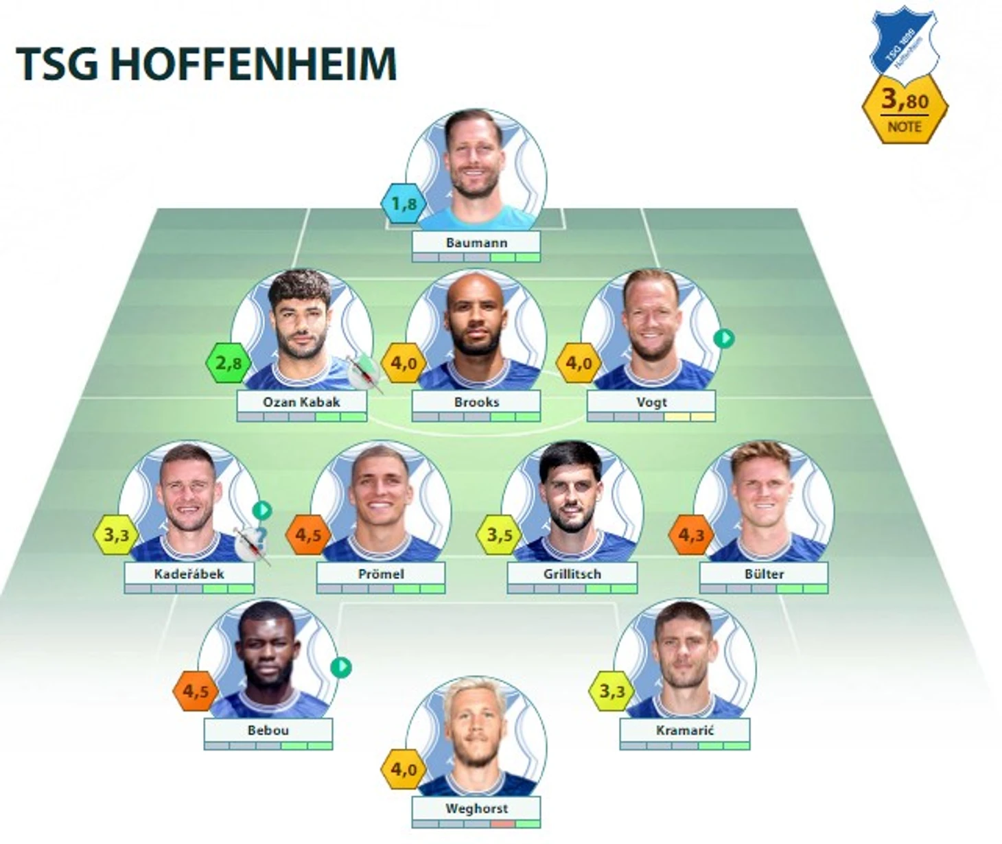 «Хоффенхайм»: Baumann (c) - Kabak, Vogt, Brooks - Kaderabek, Prömel, Grillitsch, Bülter - Kramaric - Bebou, Weghorst