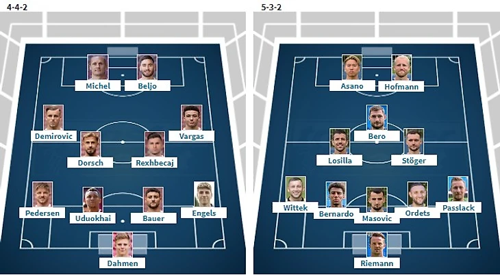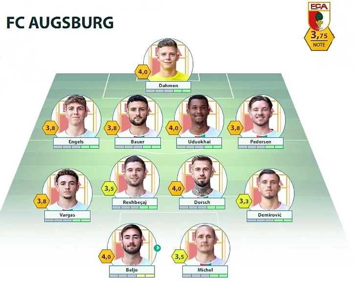 «Аугсбург»: Dahmen - Engels, Bauer, Uduokhai, Pedersen - Maier, Rexhbecaj, Dorsch, Vargas - Michel, Demirovic (c)