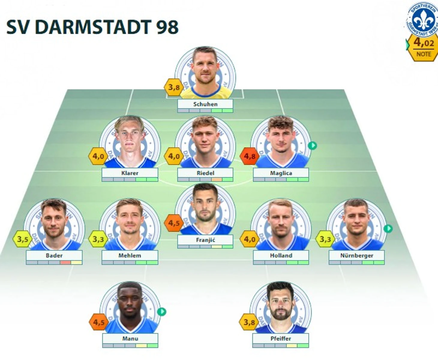 «Дармштадт»: Schuhen - Klarer, Zimmermann, Maglica - Bader, Mehlem, Franjic, Holland (c), Nürnberger - Manu, Pfeiffer
