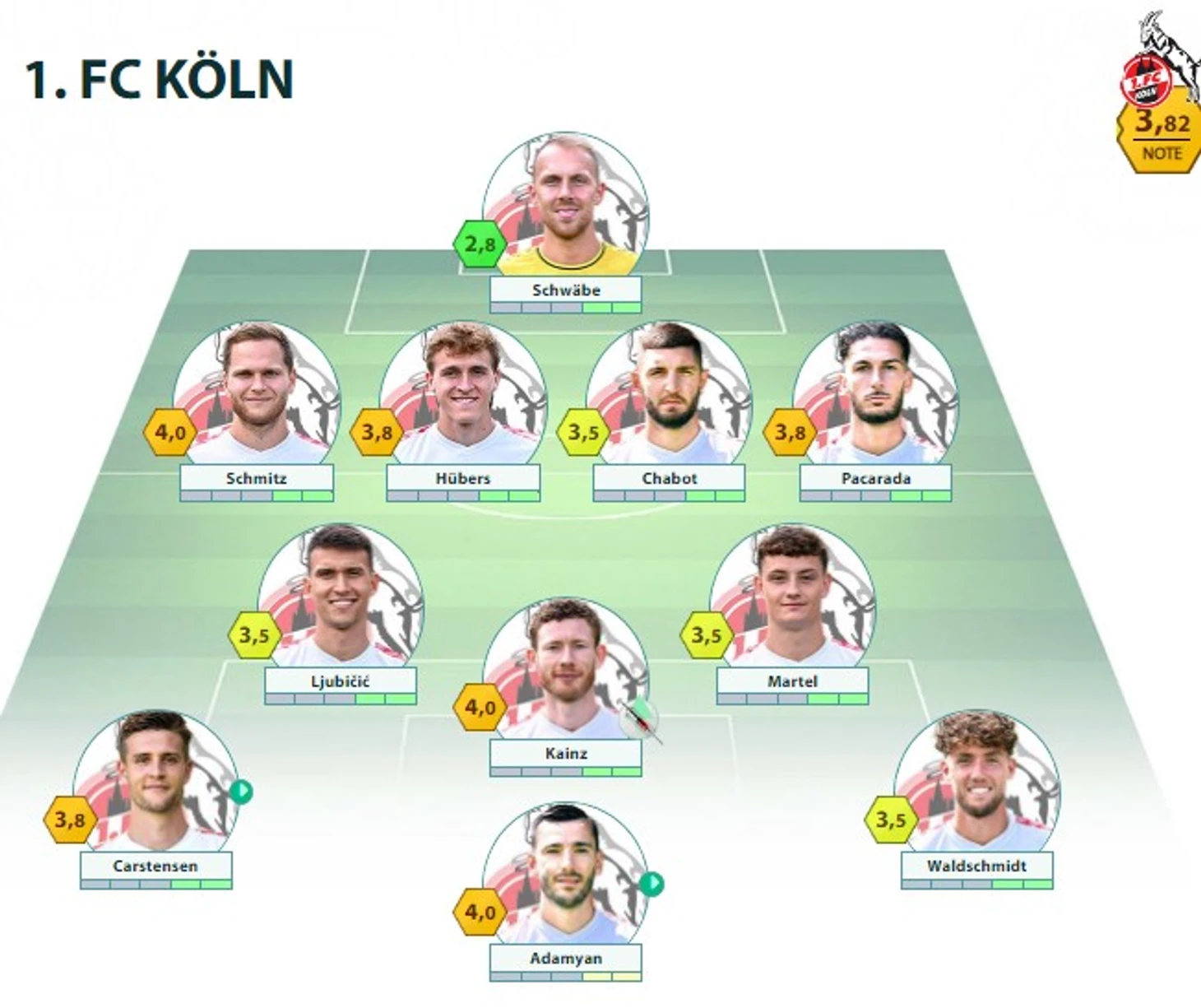«Кельн»: Schwäbe - Schmitz, Hübers, Chabot, Paqarada - Ljubicic, Martel - Carstensen, Kainz (c), Waldschmidt - Adamyan