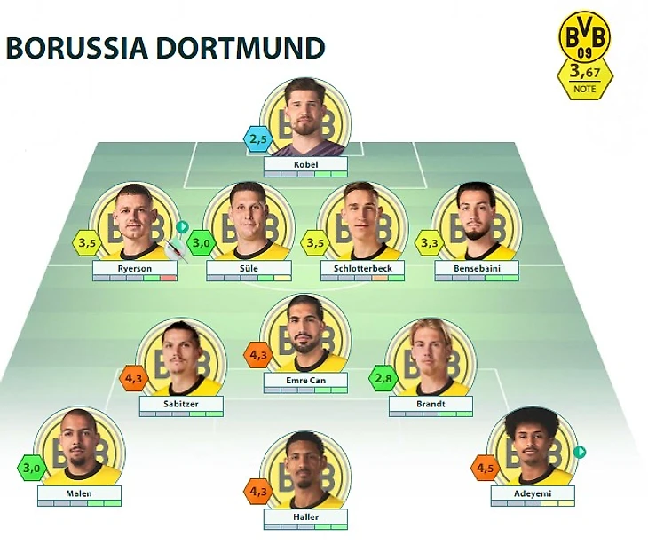 «Боруссия Дортмунд»: Kobel – Ryerson, Süle, Schlotterbeck, Bensebaini – Sabitzer, Can (c) – Malen, Brandt, Adeyemi – Haller;