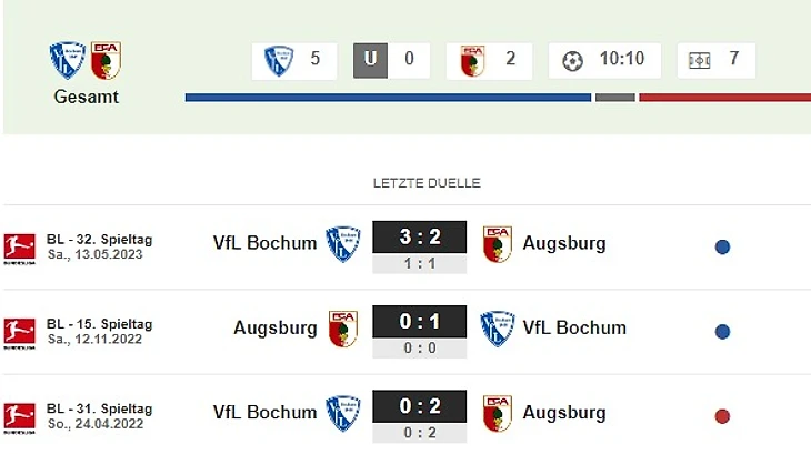 - А вот «Аугсбург» дома проиграл «Бохуму» все три официальных матча: в Бундеслиге – 2:3 (2021/22) и 0:1 (2022/23) и во 2-й Бундеслиге – 0:1 в январе 2011 года.