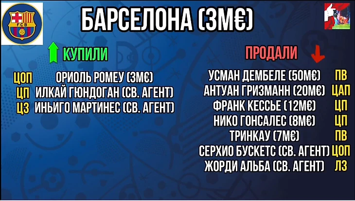 3.5 миллиона – это всё, что сумела выжить из себя каталонская команда. Да Ромеу и Гюндоган – это хорошо, но справа кроме юного Ямала и Рафиньи никого толкового нету, на весь сезон вряд ли хватит обоих + на левом фланге ещё больше проблем (Фати уходит). Да и без Бускетса первое время я думаю будет тяжело. Для того, чтобы бороться за высокие стадии ЛЧ, состав слабоват и сыроват. Так что ставим только три балла.