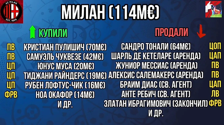Переходим к Серии А, у которой один только «Милан», лидирующий по расходам, потратил меньше, чем 7ая команда АПЛ. С россонери мы и начнём.
