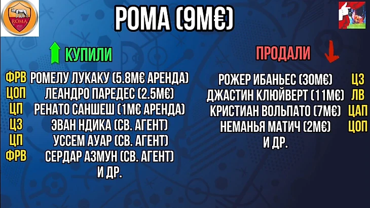 Несмотря на то, что команда Жозе тоже провалила старт сезона, их трансферы выглядят куда умнее и перспективнее. Саншеш, Паредес, Ауар, Ндика, Азмун, Лукаку – и всё это за 9.5 млн. евро. Браво! Понятно, что с таким составом за чемпионство бороться наивно, но за 4рку можно и нужно.