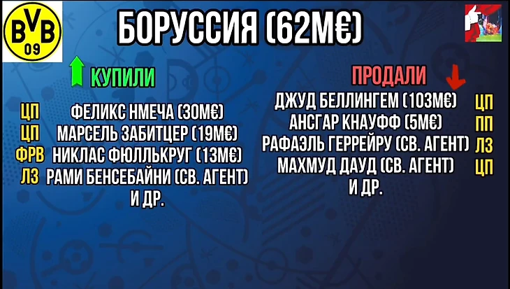 У главного конкурента «Баварии» «Боруссии» после ухода Беллингема и Геррейру заметно ослабел состав, хотя в тоже время, чтобы восполнить потерю Джуда, накупили сразу двух неплохих хавов: это и Забитцер конечно же, и Нмеча. А португальца попробует заменить левый фулбек Бенсебайни, алжирец уже 4 года играет в Бундеслиге. Я лично не верю в чемпионство Дортмунда от слова совсем, да и за трансферы им только 3.