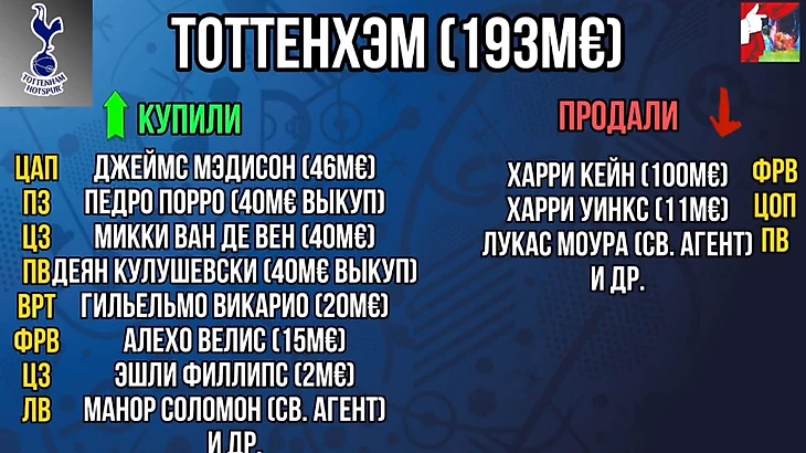 Все первые 3 места по затратам заняли у нас лондонские команды, но в отличие от своих коллег шпоры и продали на кругленькую сумму. Спустя столько лет мучений клуб наконец-то покинул Харри Кейн, из этого кстати вырастает 1ая проблема команды Постекоглу – отсутствие топ форварда. Понятно, что Ришарлисон 100% с задачей класть по 20-30 за сезон не справится, да и не поникнет ли Сон без своего друга – тоже одна из интриг.