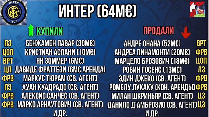 Несмотря на то, что нерадзурри летом команду покинул Онана, Брозович, Лукаку, Госенс, Джеко и другие, они решили пойти уже проверенным в последние годы путём и брать звёздных игроков либо в аренды, либо в статусе свободных. Так в команде появился Арнаутович, Куадрадо, Тюрам и Алексис + Зоммер пришёл на замену Онане.