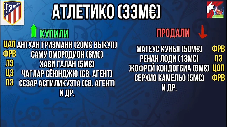 «Атлетико» в это межсезонье тоже не стал сильнее. Накупили свободных агентов: Сююнджу и Аспиликуэту, взяли из «Сельты» левого бровочника Хави Галана, но зато генильно сплавили в Англию Кунью за 50 миллинов да и + в отличие от той же «Барсы» у матраскиков куда более вариативный и сыгранный состав, если судить по концовке прошлого сезона. За трансферы – три с половиной, за перспективы твёрдая «4+».