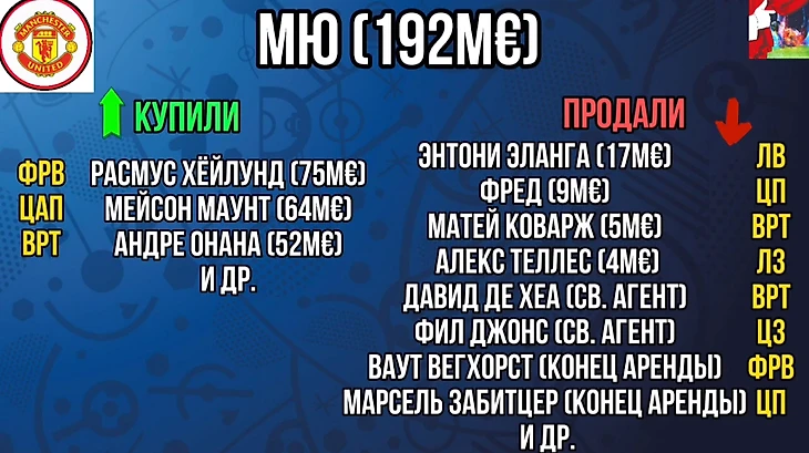 А вот «МЮ» с такой трансферной политикой может и не попасть в топ-4. Заменили Де Хеа на Онану – это 10 из 10, да хорошо, но 75 миллионов за форварда пусть и созвучного с Холландом, но лишь с 9ю мячами в лиге в прошлом сезоне – это чересчур много. Кто будет забивать - ответа нет. Ну неужели опять «all in» на Рэшфорда? Я лично думаю, англичанину архи сложно будет повторить баллы предыдущего сезона.