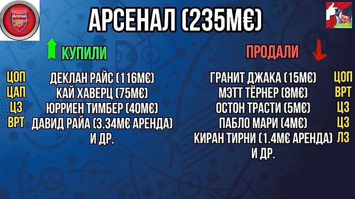 Следующая команда, которую мы обсудим, это «Арсенал». Реальных новичков, если не считать аренд, у канониров всего трое, но зато один Деклан Райс чего только стоит (это кстати самый дорогой трансфер во всём футболе в 2023 году).