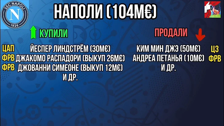 У Наполи +- похожая история с «Юве», львиная доля патраченных денег – это выкупы, но всё же основной костяк неаполитанцы сохранили, да ушёл Ким, но вряд ли это прям катастрофа, состав ещё молодой, горячий, поэтому обновлений особо и не требовалось, так что 4ка я думаю заслуженная.