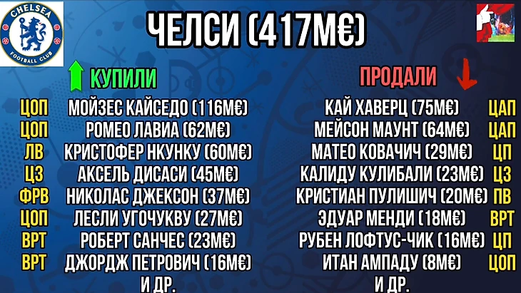 Начинаем с «Челси», который вот уже второе окно подряд не имеет равных в плане расходов. Боули всё лето делал вид, что он чистит состав, но в итоге очистил так что стал слабей, и ушёл в немалый минус. Команду покинуло куча приносивших титулы игроков: Хаверц, Маунт, Ковачич, Канте, Менди и Кепа. Если смотреть на тех, кого купили, то из реально способных усилить команду игроков только трое: Никлас Джексон, Кристофер Нкунку и Мойзес Кайседо. Остальные либо молодые ноунеймы, либо середняки (как Санчес и Лавиа).