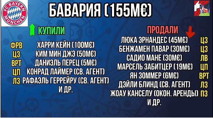 «Бавария», как и «ПСЖ», тоже прошла своего рода очищение: ушёл, портящий атмосферу Мане, ну а главной покупкой стал конечно же Харри Кейн. Сейчас все кому не лень твердят, что с англичанином «Бавария» становится главным фаворитом на все возможные кубки, я склонен согласится с этим, ведь если Харри в «Тоттенхэме» забивал по 30 за сезон в лиге, то страшно представить, что будет в Германии. Также ряды мюнхенцев пополнил Ким Мин Джэ из «Наполи», Рафа Геррейру и вратарь Перец.