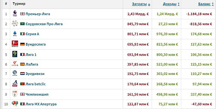 Ну и только 6ая по затратам испанская Ла Лига, видимо рычаги «Барсы» закончились)))
