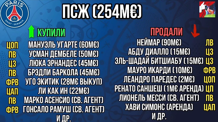 В общем теперь Килиан может вздохнуть спокойно, никто на его трон в Париже теперь не претендует, а с таким напарником как Дембеле, с таким классным подыгрывающим как Рамуш, «ПСЖ» должен быть конкурентоспособным даже на высоких стадиях ЛЧ. Понятно, что трофей вряд ли возьмут, но если сохранят структуру и веру в тренера, то год-два - и трофей окажется на Елисейских полях. Оценка за трансферы 5.