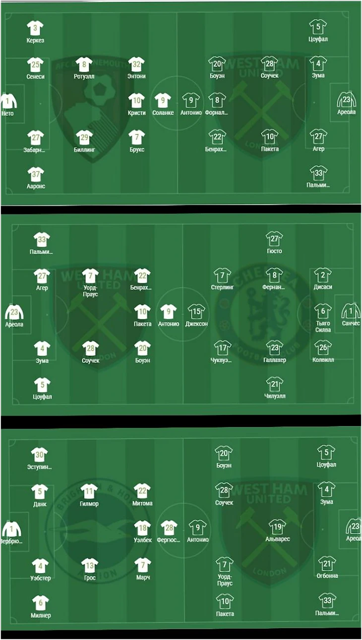 Мы видим довольно стабильный состав в начале сезона 8 игроков выходили с первых минут. Найеф Агерд удалился во втором матче можно предположить что и в третьем за место Анджело Огбонны вышел бы марокканец. Встроился Джеймс Уорд-Прауз. Десять игроков провели два из трех первых матчей.