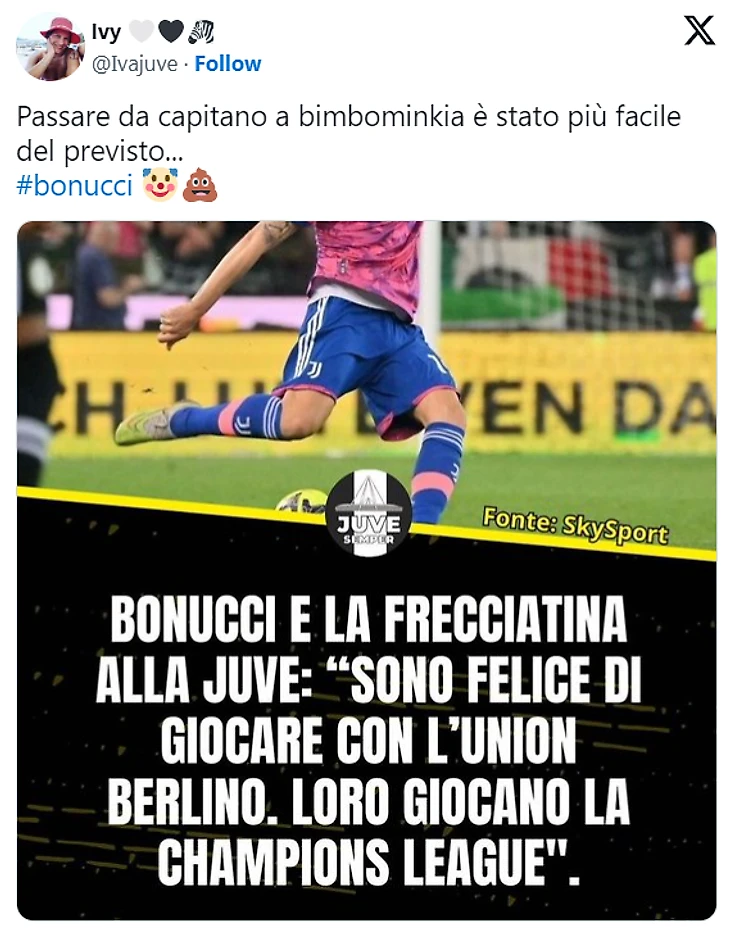 💭Путь от капитана до главного раздражителя и клоуна оказался очень коротким. Цитата Бонуччи: «Я рад играть за «Унион Берлин». Они играют в Лиге чемпионов».