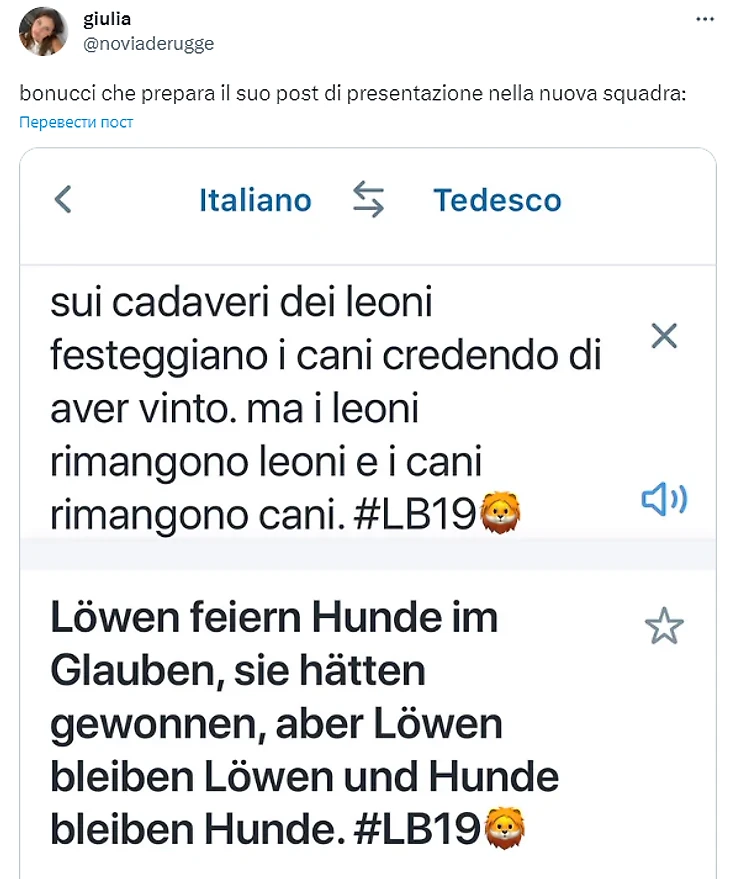 💭Леонардо Бонуччи готовит речь для нового клуба: львы чествуют собак, веря, что именно они победили. Но львы − это львы, а собаки − это собаки.
