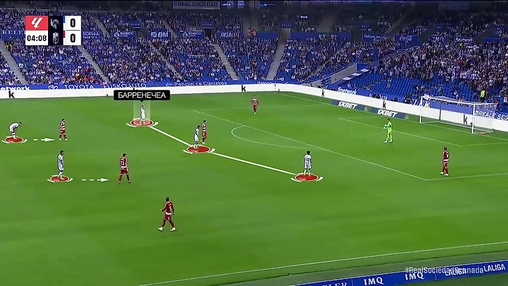 Так «Сосьедад» встречал соперника в первом тайме – схема 4-3-3 с узкой тройкой, которая начинает давление. Андер Барренечеа (его заменит Захарян) – часть этой тройки: