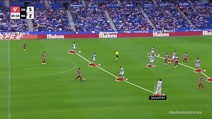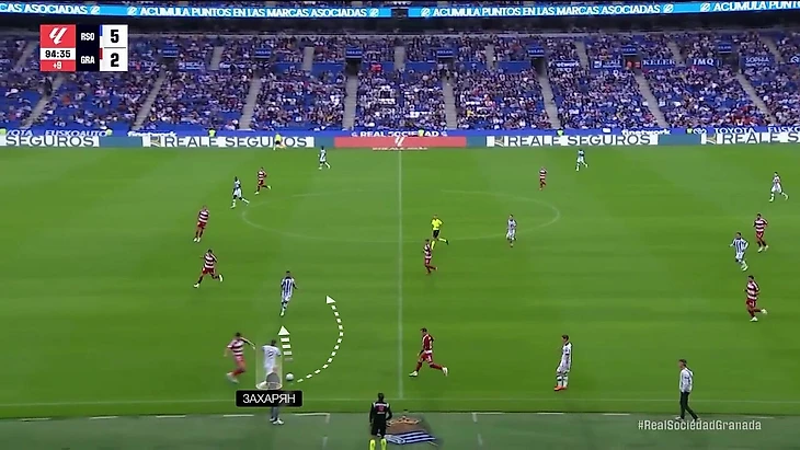 «Сосьедад» – одна из самых прессингующих команд Ла Лиги. Но Захарян выходит на отрезки, когда интенсивность падает.