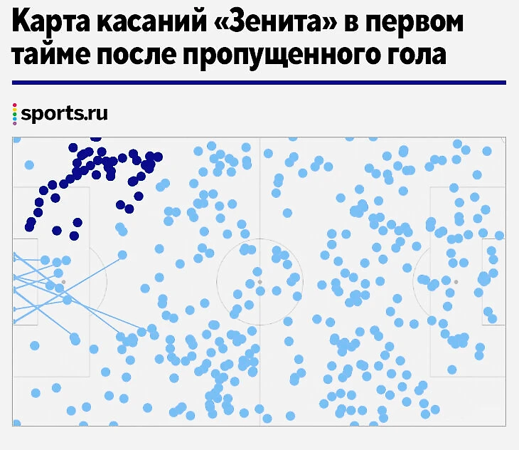Как только пропустил, «Зенит» забрал инициативу: до перерыва контролировал мяч 70% времени, вел 9:1 по ударам (единственная попытка Гайича заблокирована), доминировал по действиям в штрафной (19:3) и подал 10 угловых. Ниже – карта касаний «Зенита» в первом тайме после пропущенного (ворота ЦСКА – слева), где видно, что команда Семака зависала на чужой трети как раз справа.