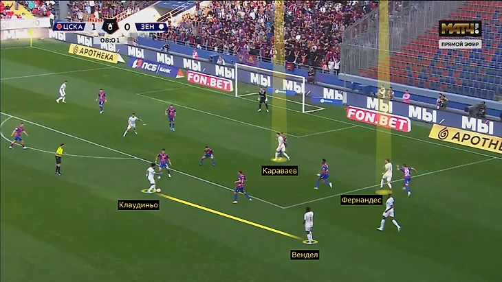 «Зенит» атаковал с помощью подключений Марио и Караваева: Фернандес принимал диагонали, подыгрывал и открывался в зоне между Мойзесом и Гайичем, а Вячеслав сдаваивал фланг и мог меняться с партнером. Плюс туда приходили Вендел и Клаудиньо, благодаря чему «Зенит» там комбинировал. Марио не раз опасно вбегал в эти зоны и зарабатывал стандарты.