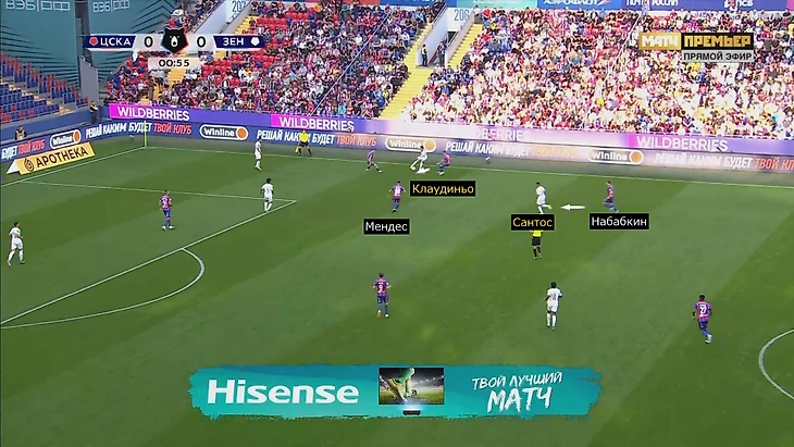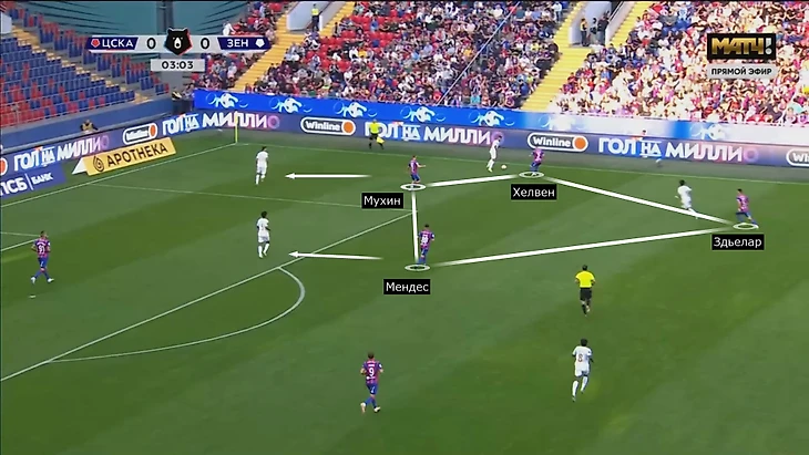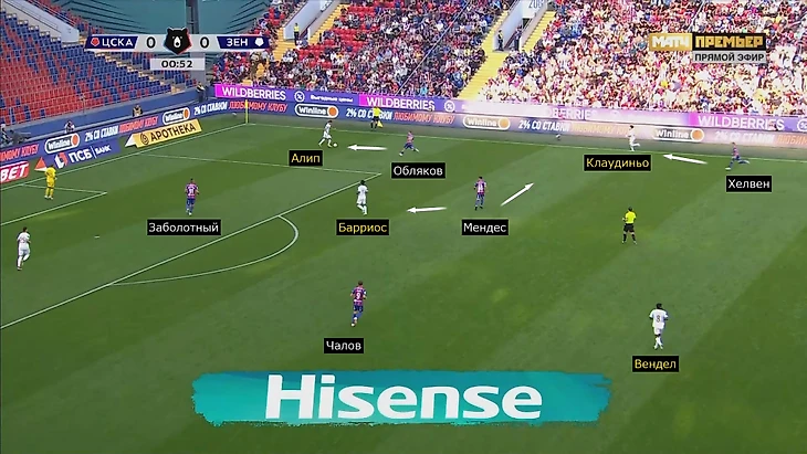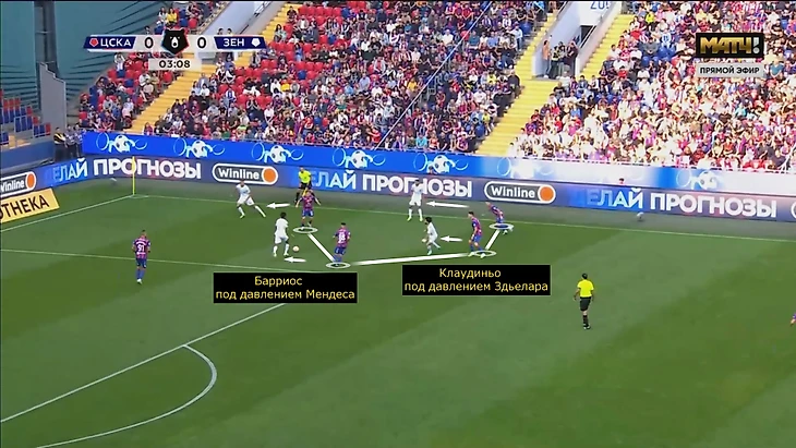 ЦСКА встречал «Зенит» после передач назад или на фланг. При атаках слева ЦСКА разбирал главных интеллектуалов гостей: Сантос и Клаудиньо/Вендел моментально оказывались под давлением. Перед голом «Зенит» дважды терял владение: в первом эпизоде Клаудиньо не обыграл Хелвена (мяч ушел в аут).