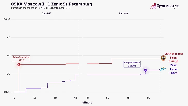 Команда Федотова за всю игру сделала лишь шесть касаний в чужой штрафной (выделяются только гол и удар Чалова). ЦСКА переиграл «Зенит» по xG, однако почти вся ценность скрылась в голевом моменте – в остальное время команда Федотова была стерильной впереди.
