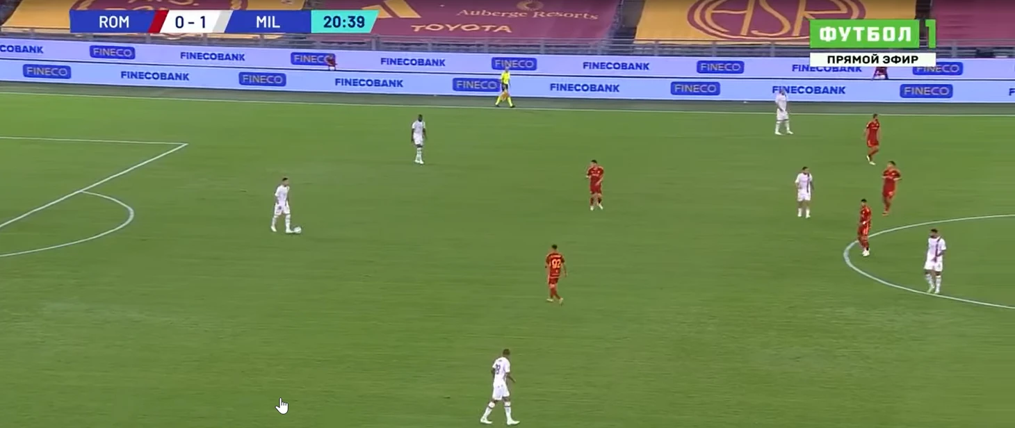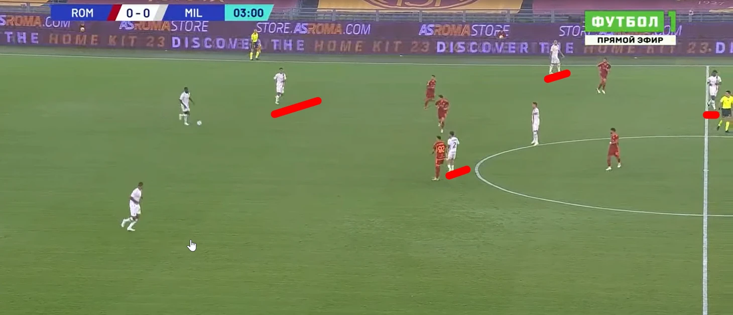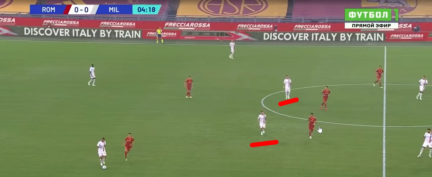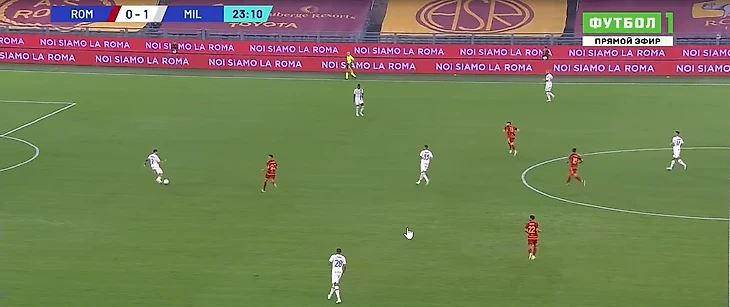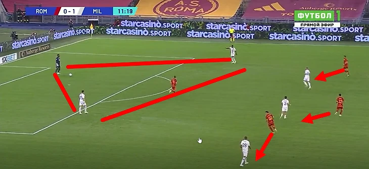 А бывает так, что Меньян становится третьим центральным защитником и устраивает перепас с центральными защитниками, позволяя тем растягиваться по ширине. Таким образом Милан получает численное преимущество в розыгрыше мяча.