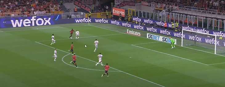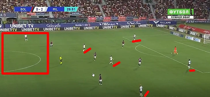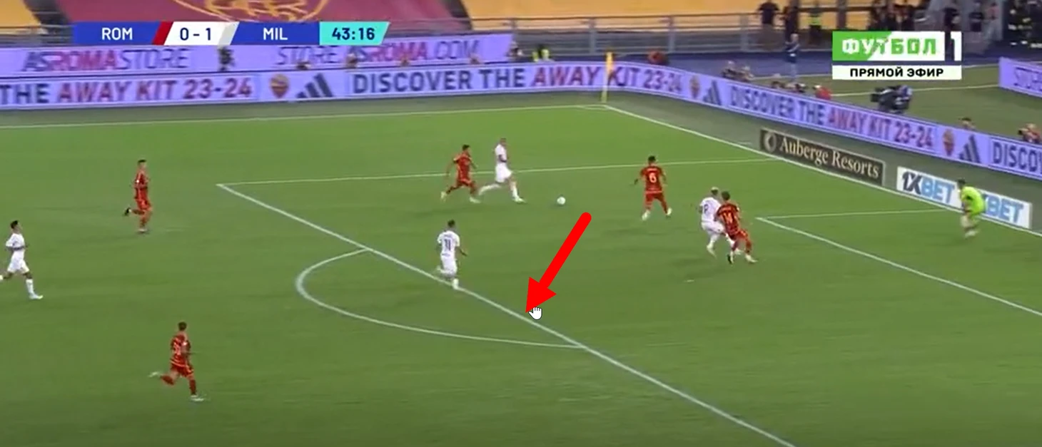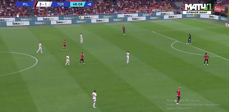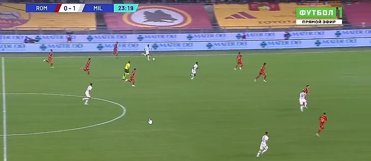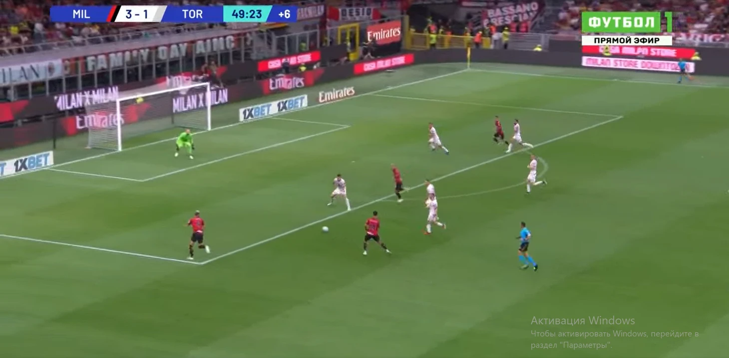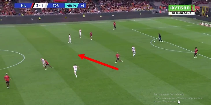 Если нужно Ти сам подключается к атакам, в этом заключается еще одна наработка мистера Пиоли. Часто мы в прошлых сезонах видели как на Леао собираются двое зашитников. Пиоли придумал как из этого извлекать пользу. Ситуация как на скриншоте повторяется буквально в каждой игре. Жаль пока удар у голландца не получается.