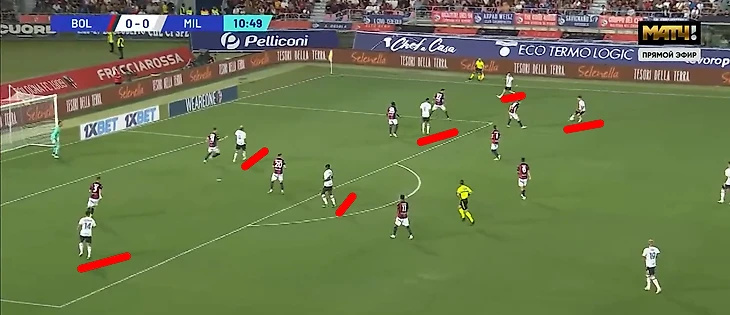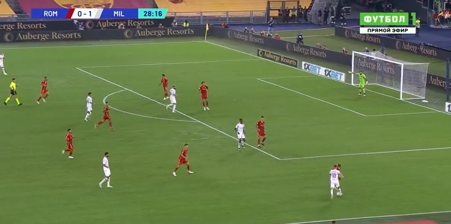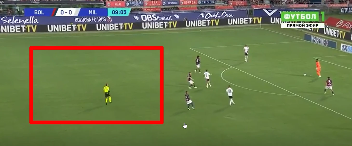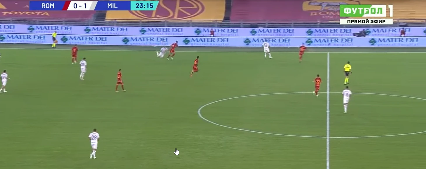 Если нужно Ти сам подключается к атакам, в этом заключается еще одна наработка мистера Пиоли. Часто мы в прошлых сезонах видели как на Леао собираются двое зашитников. Пиоли придумал как из этого извлекать пользу. Ситуация как на скриншоте повторяется буквально в каждой игре. Жаль пока удар у голландца не получается.