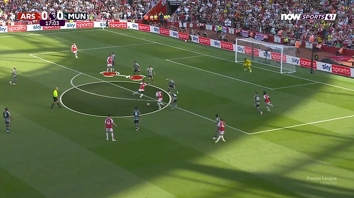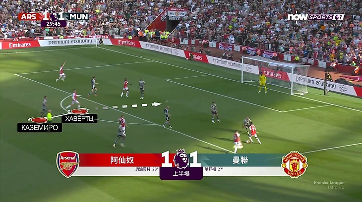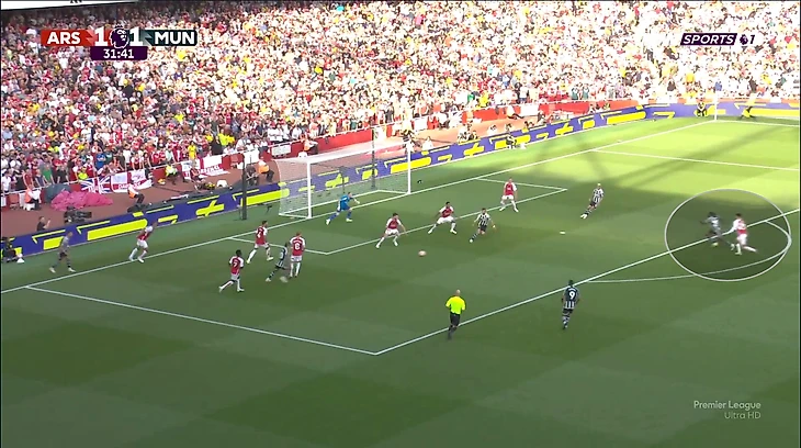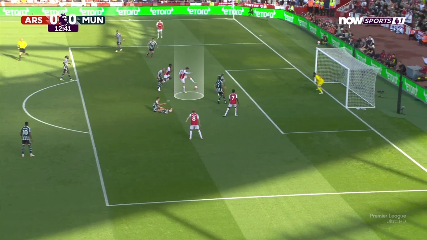 «Юнайтед» расправился с ним и быстро довел мяч до атаки. Теперь от Хавертца требуется рывок к штрафной. Делает его и заодно закрывает Аарона Уан-Биссаку: