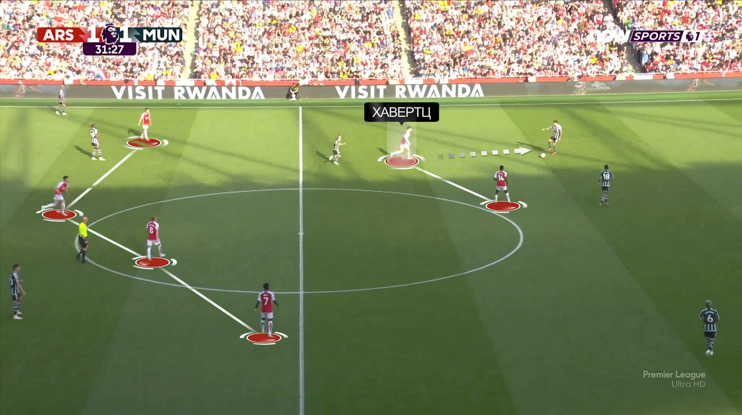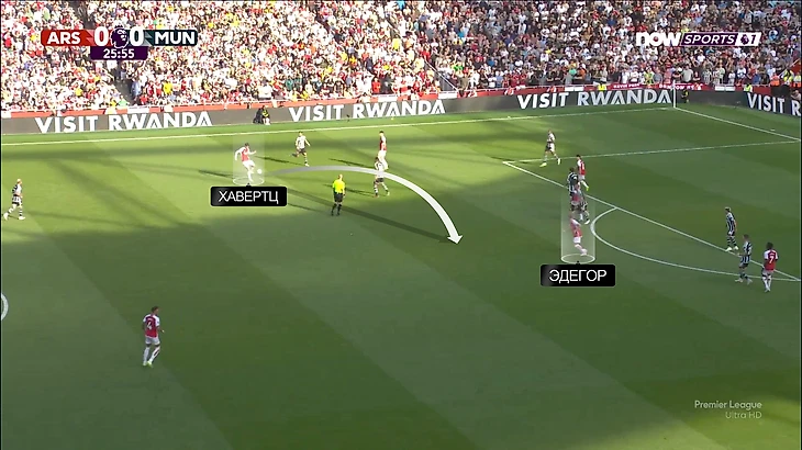 Очевидно, что Кай привыкает не только к новым партнерам – еще нужно подстраиваться под структуру позиционных атак. Она у Артеты тоже меняется на старте сезона. Были отрезки, когда Хавертцу приходилось делить зону у левого фланга с Декланом Райсом. Против «МЮ» Кай впервые вышел с Александром Зинченко – до этого Хавертца поддерживали только защитники правши.