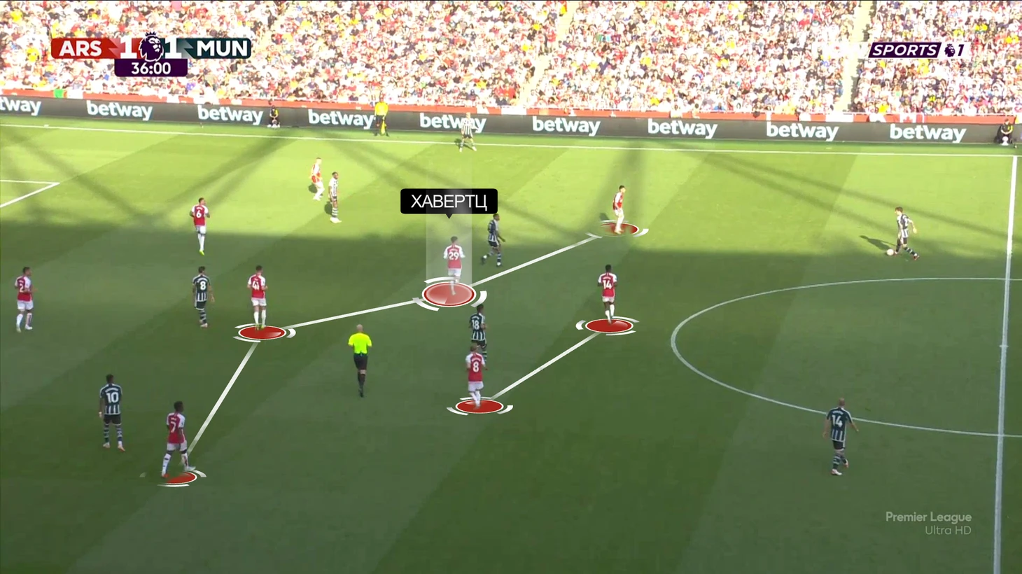 Начало момента – Хавертц в роли оттянутого нападающего. Пытается притормозить атаку «МЮ»: