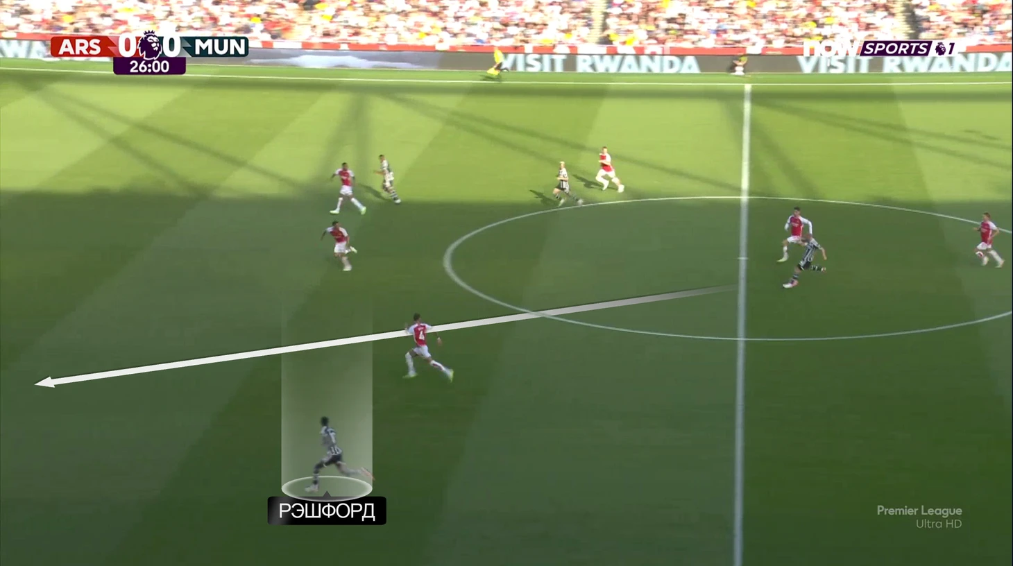 Вот так Хавертц начал голевую атаку на ворота «Арсенала». Неудачный пас на Эдегора, перехват Кристиана Эриксена – и Маркус Рэшфорд не прощает, когда ему дают разбежаться: