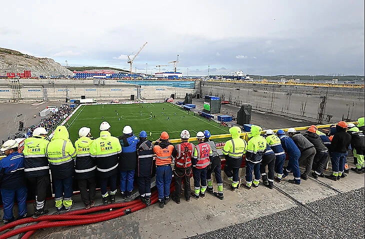 Сейчас тут строят фундамент для третьей платформы. Я как раз им занимаюсь, поэтому матч немного мешает, хаха. Мы принимали участие в строительстве этого стадиона и поля. Приятно смотреть – людям нравится, погода хорошая. Я уже не молод, много где был, многое видел, но не такое. Построить футбольное поле и стадион в таком большом доке, на высоте -16 метров от уровня моря… Это очень круто».