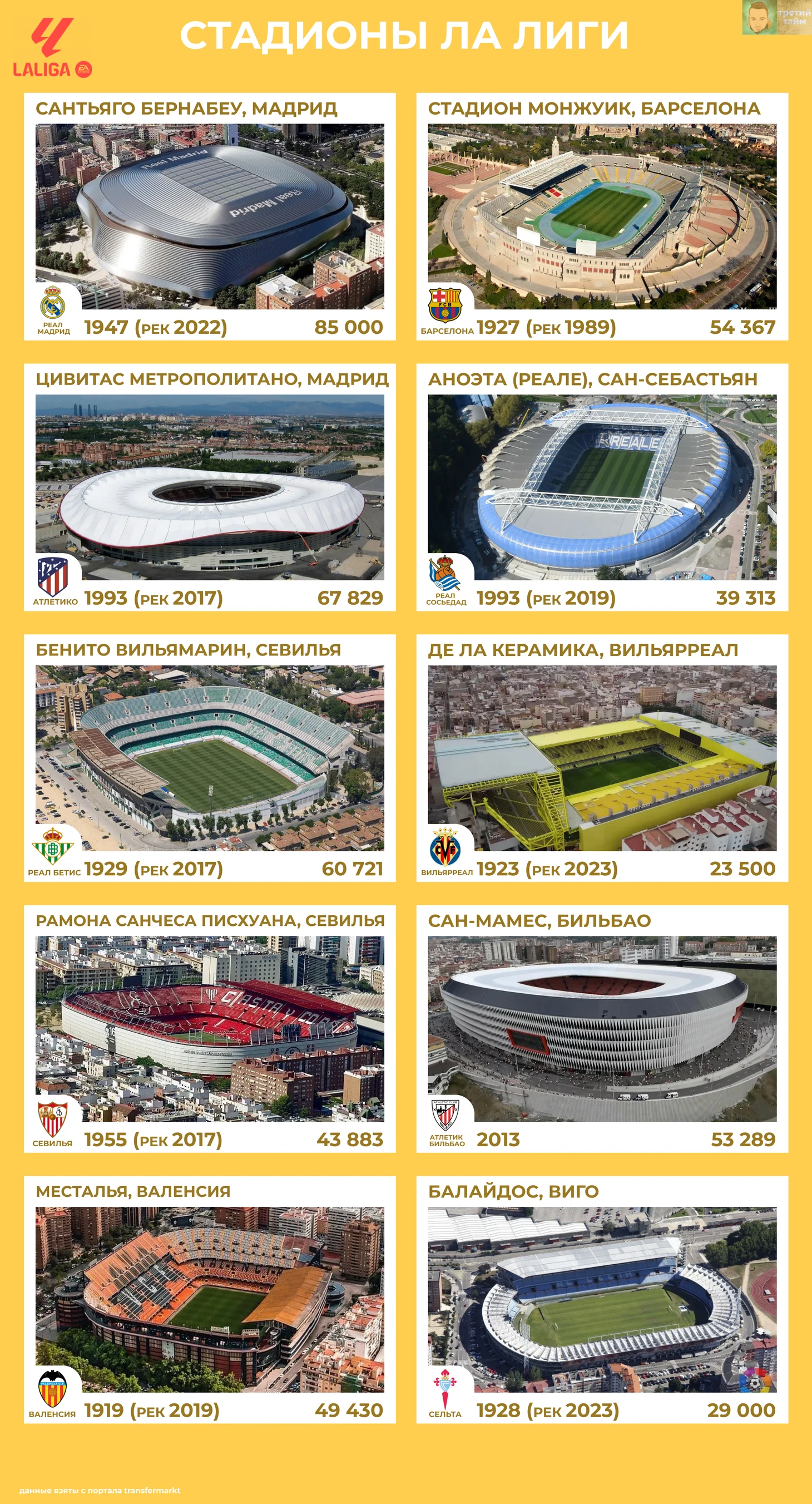Ну начну сразу с главных клубов страны. «Реал Мадрид» и «Барселона» занимаются реконструкциями своих арен. Столичный клуб уже играет на почти обновленной арене, а строительные работы полностью закончатся в конце 2023 года.