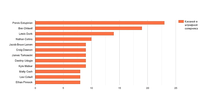 По касаниям в штрафной удивляет больше всего, наверное, Льюис Данк. Не тот человек, от которого ждешь голов и передач. Натан Коллинс — думаю был бы даже неплохим выбором, если по каким-то причинам не нравится Пиннок. Но после травмы в центр Брентфорда вернулся Бен Ми.