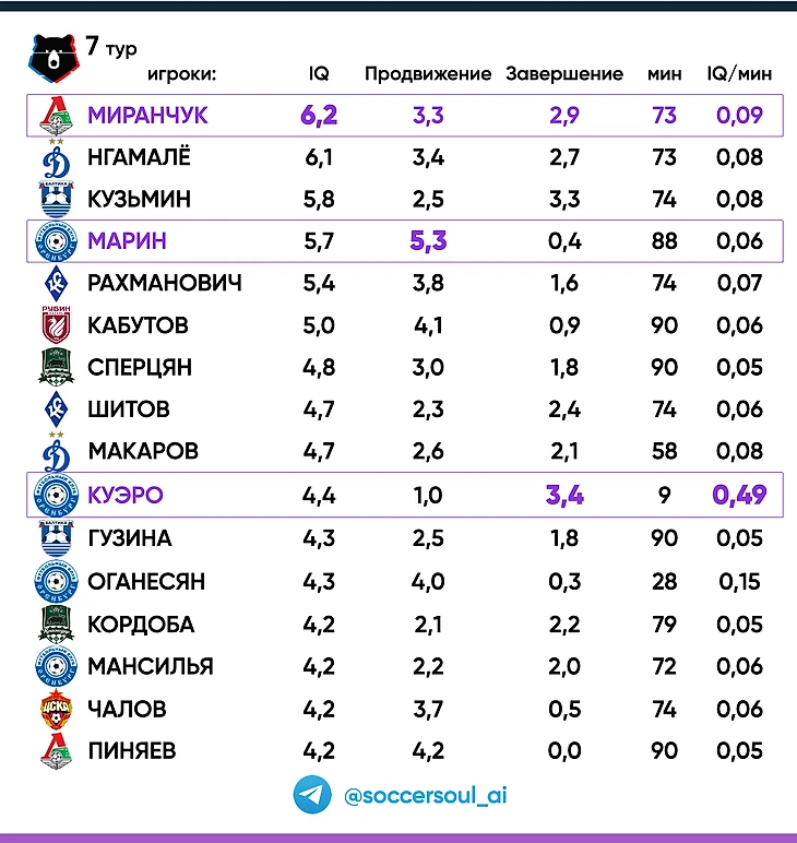Основное внимание я уделяю общему качеству игры в атаку или Soccer Soul IQ. В тройке лидеров Миранчук (Локомотив) - 6,2, Нгамалё (Динамо) - 6,1 и Кузьмин (Балтика) - 5,8. Это самые сбалансированные игроки тура, в разрезе разделения атакующих активностей на продвижение мяча и завершение атак.