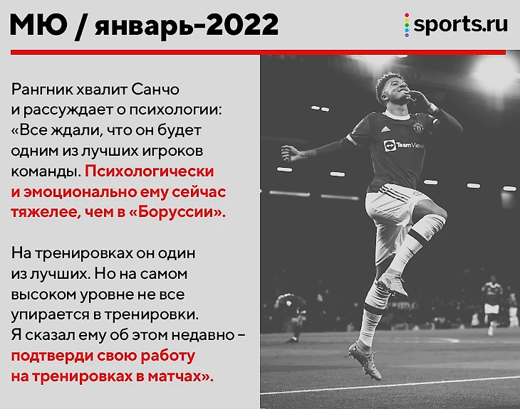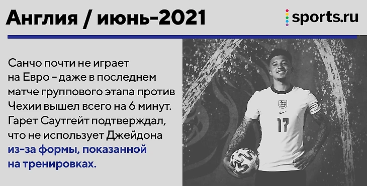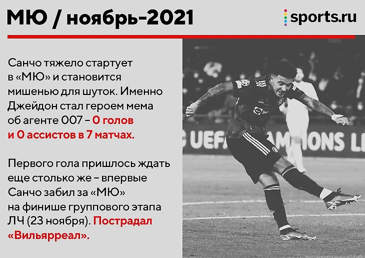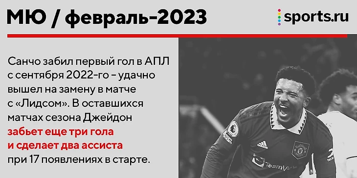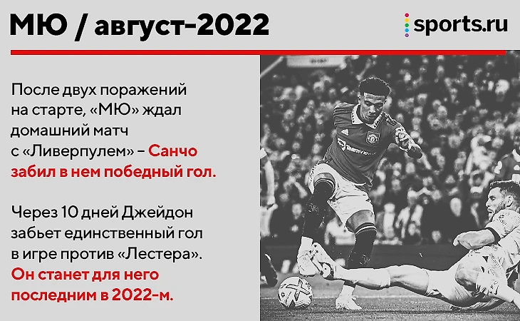 В новом сезоне у Санчо 79 игровых минут за три матча и ни одного выхода в старте. Посмотрим, изменится ли это после перерыва на матчи сборных – 16 сентября «МЮ» ждет тяжелый домашний матч с «Брайтоном».