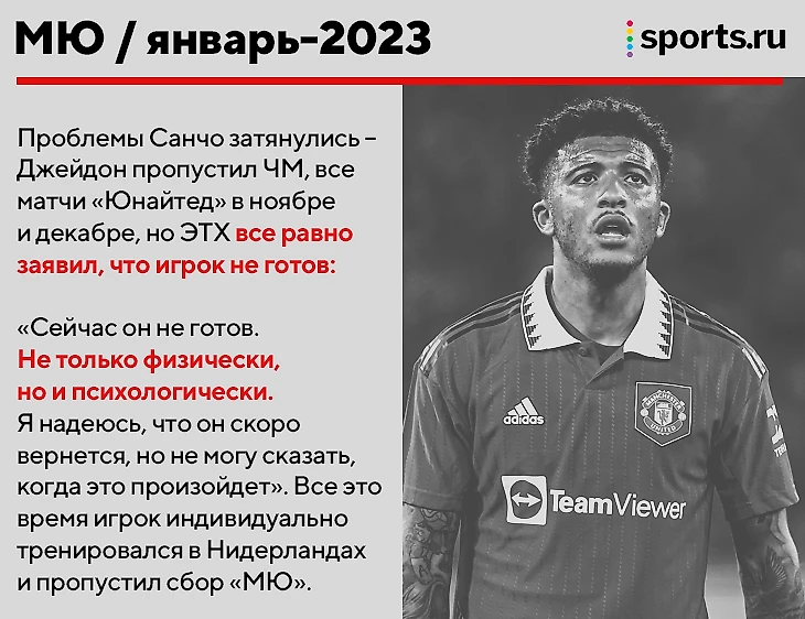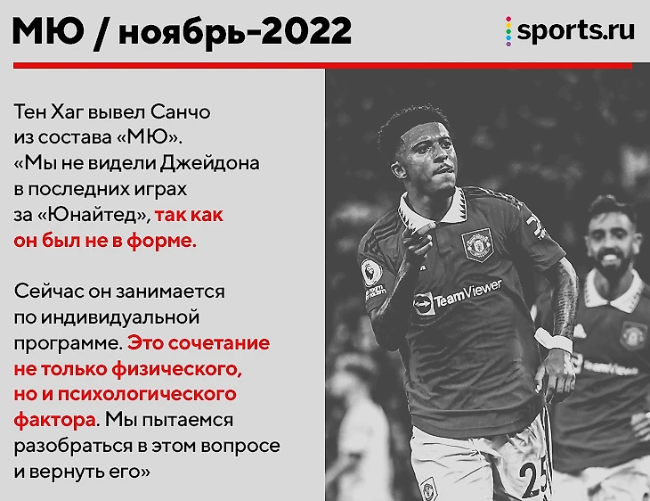 В «МЮ» неспокойно. К невзрачной игре (два поражения в четырех турах) добавился внутрикомандный конфликт – Эрик тен Хаг публично заявил, что Джейдон Санчо плохо тренируется, а потому не проходит в состав. Джейдон назвал обвинения ложью и ищет причины вне тренировочного поля.