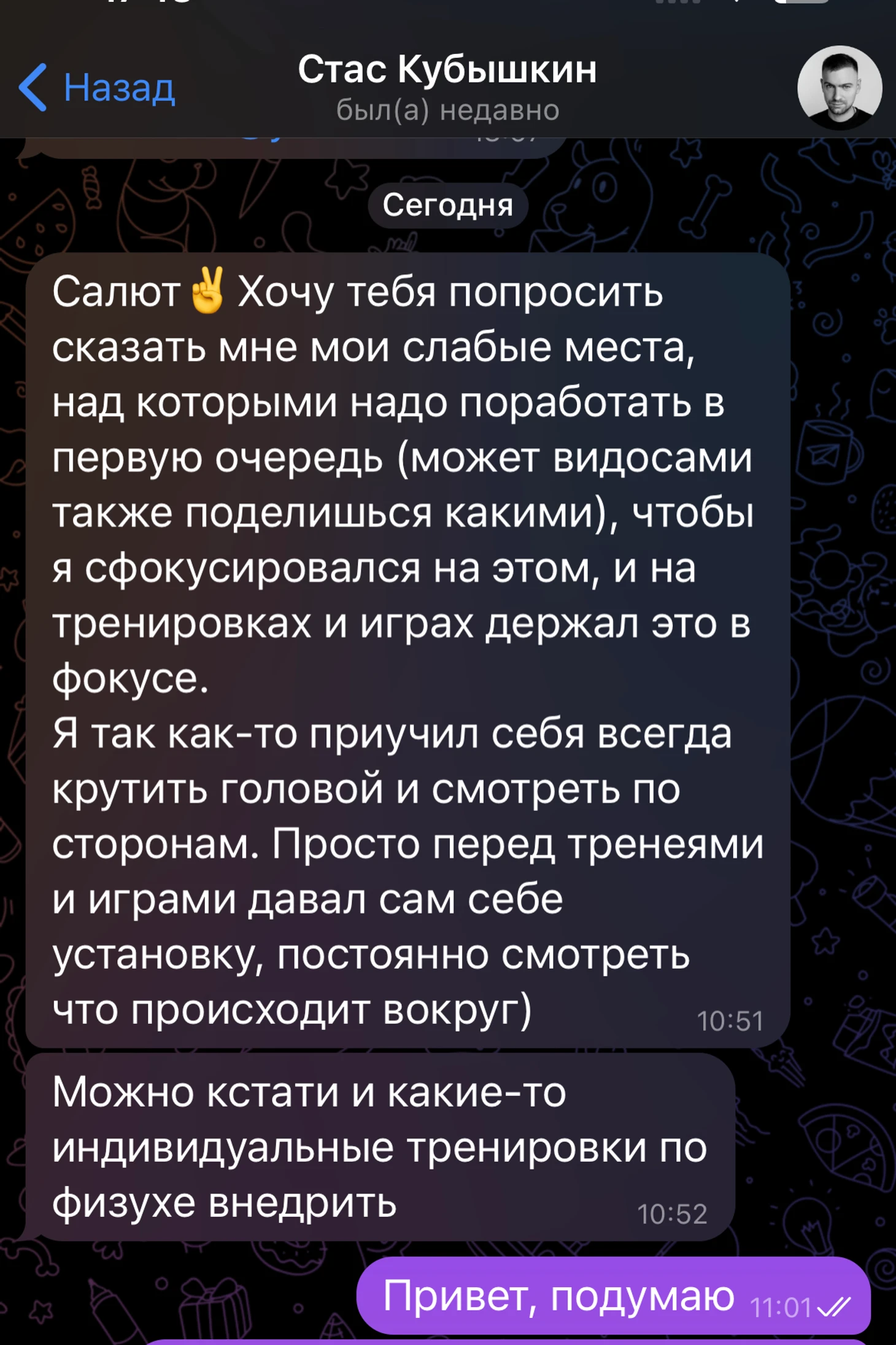 Ранее после таких запросов я обычно беседовал без особой подготовки примерно 5-10 минут, отвечал на вопросы, давал советы. Сейчас, когда таких запросов стало больше и они стали более детальные, я решил запустить «Беседы с тренером». Каждый футболист команды может записаться ко мне на беседу, к которой я буду готовиться и на беседе детально проговаривать различные моменты с отдельно взятым футболистом.