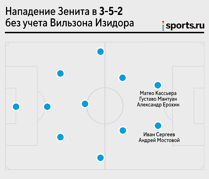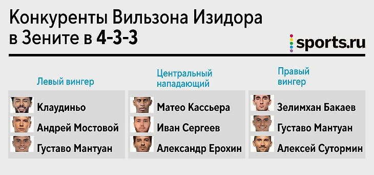 В этом сезоне «Зенит» использует 3-5-2 и 4-3-3. В первом случае позиция Изидора очевидна: его поставят центральным нападающим. Но у Семака и так достаточно вариантов: Кассьерра забивает, Сергеев – полезный джокер, стягивающий за собой игроков (и уже адаптирован к Матео), Мантуан классно сыграл со «Спартаком» (3:1) и дает «Зениту» скорость, по характеристикам на бразильца похож Мостовой. Каждый может подыгрывать и бежать за спину. А еще остался Ерохин – опция для навесов и заполнения штрафной на последних минутах.