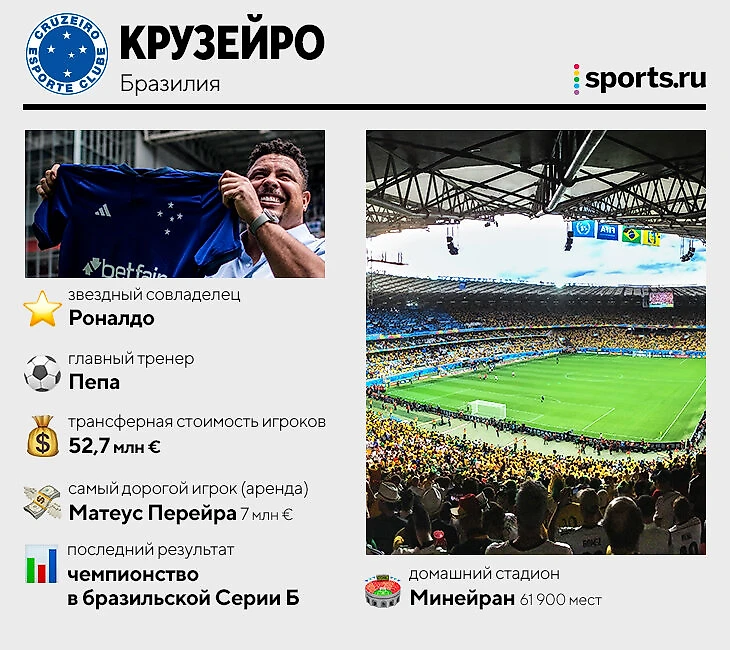 В 2019 году «Крузейро» впервые в истории вылетел в бразильскую Серию Б. Клуб влез в долги на миллиард бразильских реалов (больше 150 млн евро), футболистам не платили зарплату. Но в 2020-м Роналдо, который уже владеет испанским «Вальядолидом», купил 90% акций клуба. Именно в «Крузейро» он начинал карьеру: забил 44 гола в 47 матчах и уехал в голландский «ПСВ».