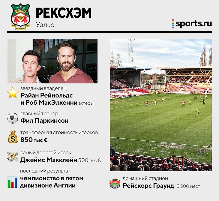 • Здесь – подробная история о становлении клуба. Если коротко: Роб МакЭлхенни посмотрел сериал Sunderland ‘Til I Die и захотел свой футбольный клуб. Райану Рейнольдсу понравилась идея, но долго искали подходящую команду. Было много критериев (например, нужен был клуб с длинной историей и большой базой болельщиков), по которым выбрали валлийский «Рексхэм». И спасли его от закрытия.