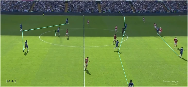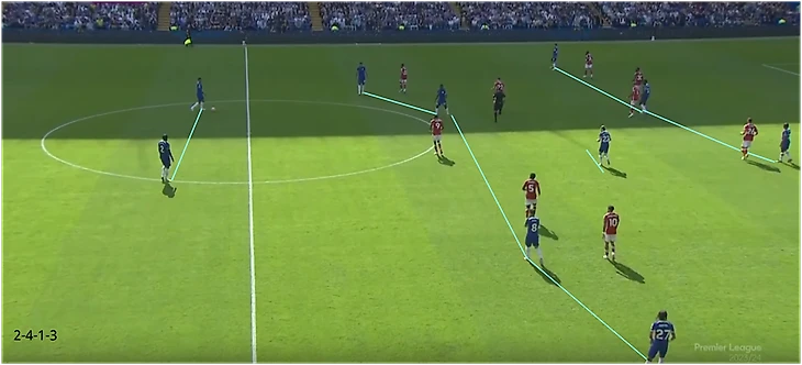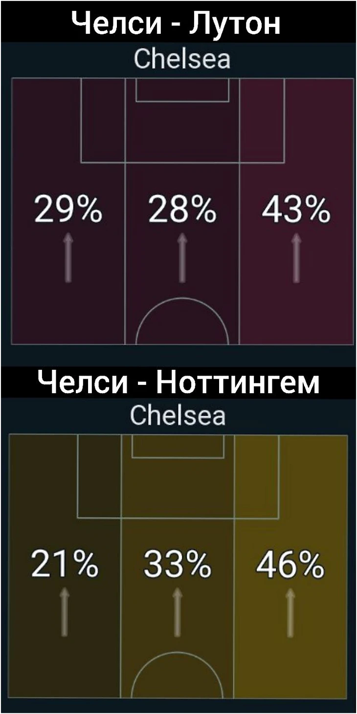 Как я уже упомянул в команде пасующий вратарь и все ЦЗ, но нет пока качественных действий в билд-апе от «шестерки» поэтому мяч низом быстро не перемещается в зону развития все сводится к персоне Энцо, так же нет игрока способного найти свободное пространство между линиями в атаке, поэтому против «автобусов» возникают проблемы. В составе находятся три инвертированных вингера, но в схеме с вингбэками никому из них нет места в составе, поэтому позицию правой восьмерки в матче с Ноттингемом занимает Палмер, а Мудрик на позиции левой восьмерки в матче с «Вест Хэмом».